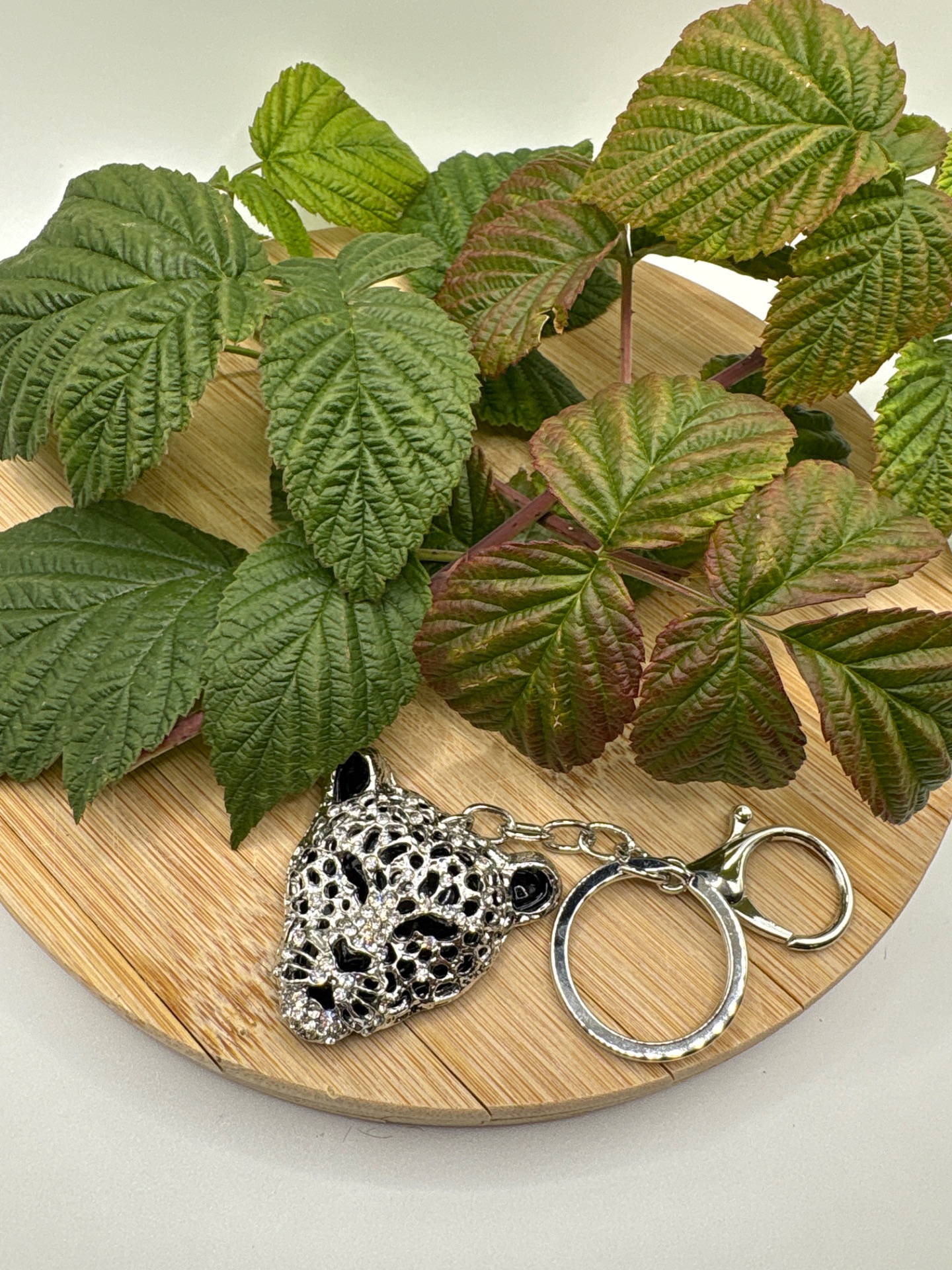 Klíčenka s motivem hlavy leoparda, ve stříbrné barvě s imitací zirkonu.