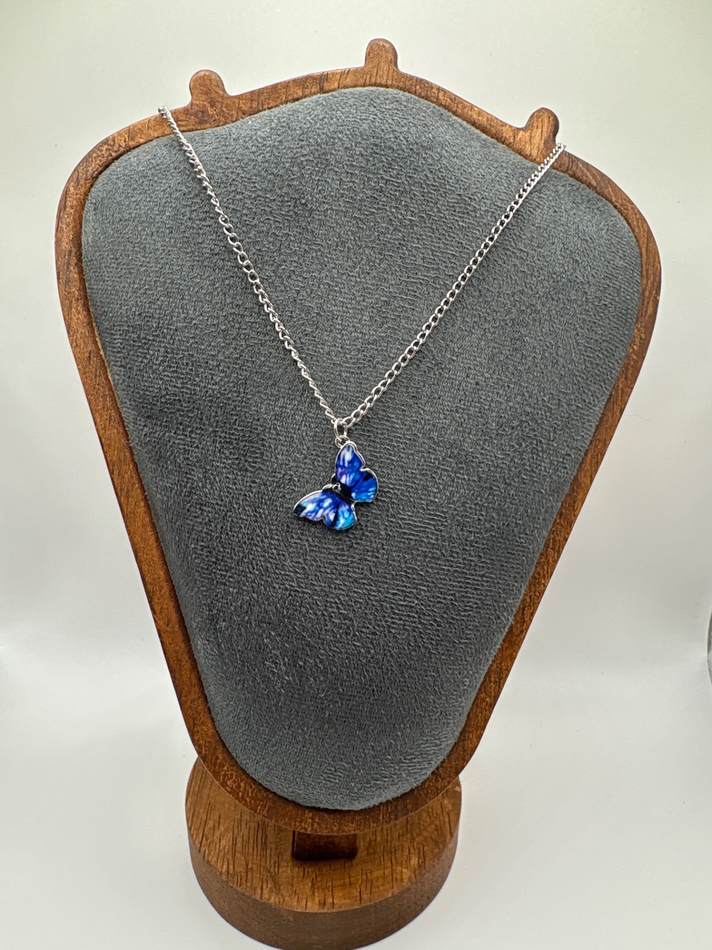 Náhrdelník ve stříbrné barvě, přívěsek modrý motýl