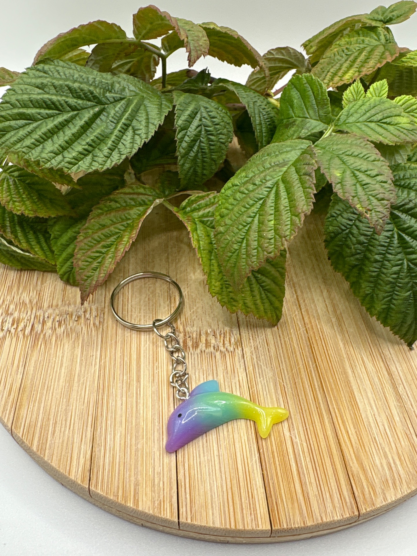 Přívěsek s motivem delfína, barevný fialovo-zelený.
