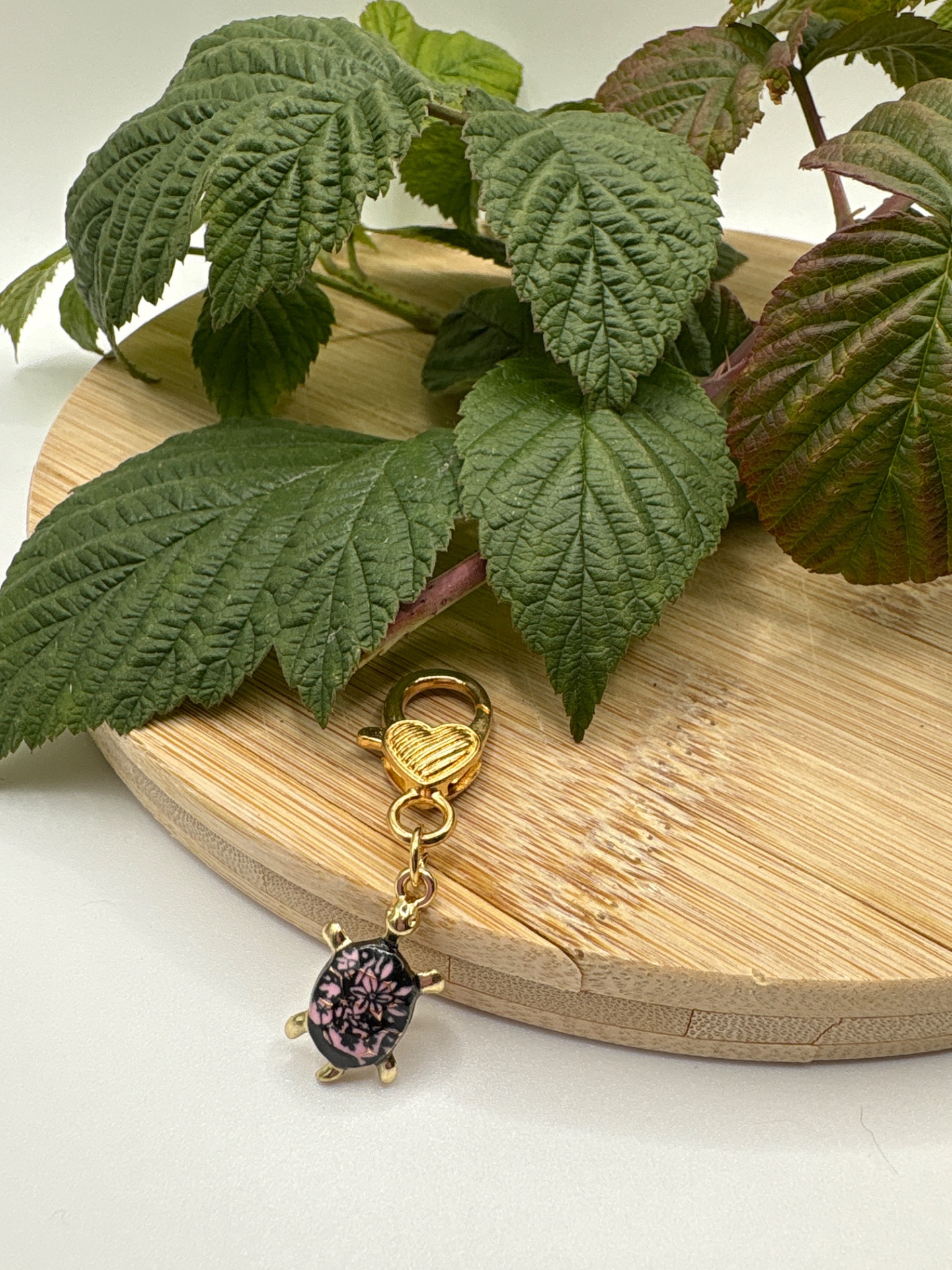 Zlatý přívěsek na klíče fialová želva. Karabinka s motivem srdce.