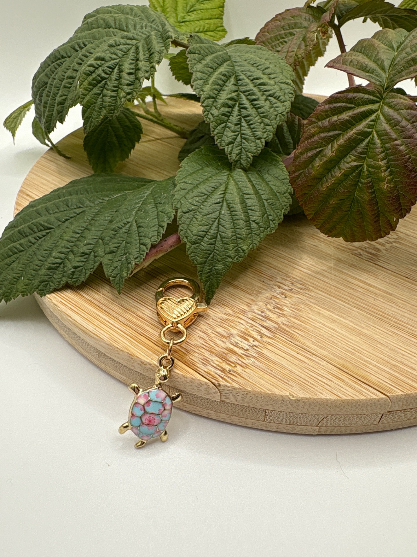 Zlatý přívěsek na klíče světle modrá želva. Karabinka s motivem srdce.