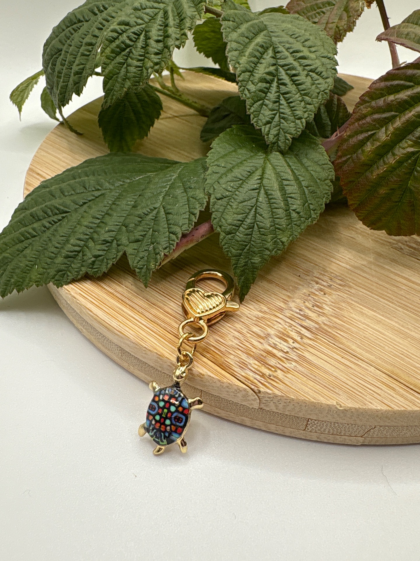 Zlatý přívěsek na klíče vícebarevná želva. Karabinka s motivem srdce.